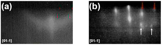 Reflection of high energy electron diffraction (RHEED) patterns of 2 ML In deposited on vicinal GaAs(111)A with 2 miscut towards at (a) 185 C (halo pattern) and at (b) 80 C (spotty pattern). Red arrows indicate RHEED reflexes from indium crystalline islands and white arrows indicate RHEED reflexes from GaAs.