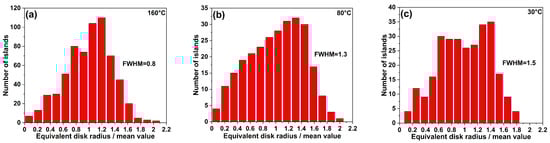 Size distributions of indium islands normalized to their mean size at (a) 160 C, (b) 80 C, and (c) 30 C calculated from 1 × 1 m AFM scans of each sample. The mean equivalent disk radius for panel (a) is 8.5 ± 3.0 nm, for panel (b) is 9.7 ± 4.1 nm, and for panel (c) is 10.6 ± 4.1 nm.