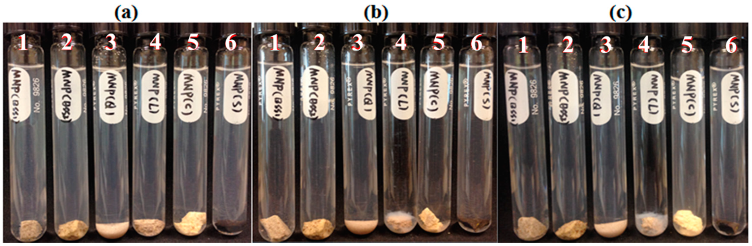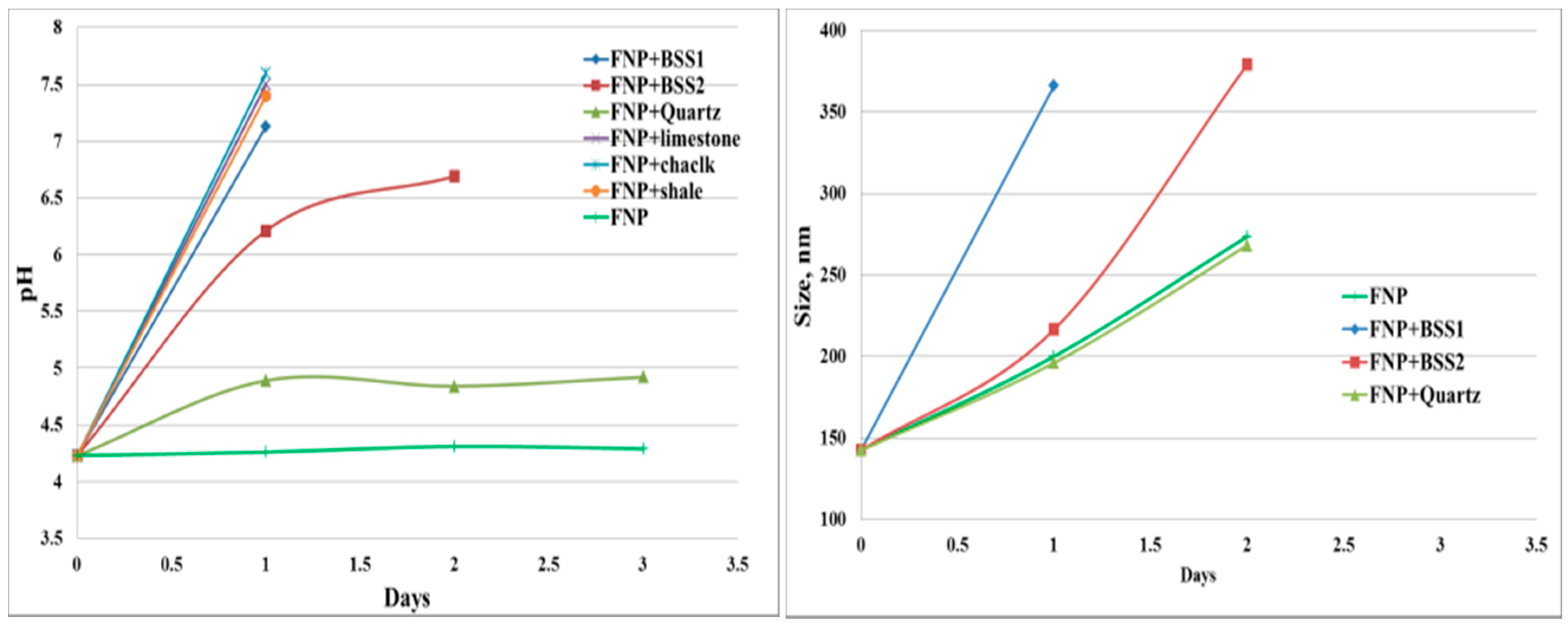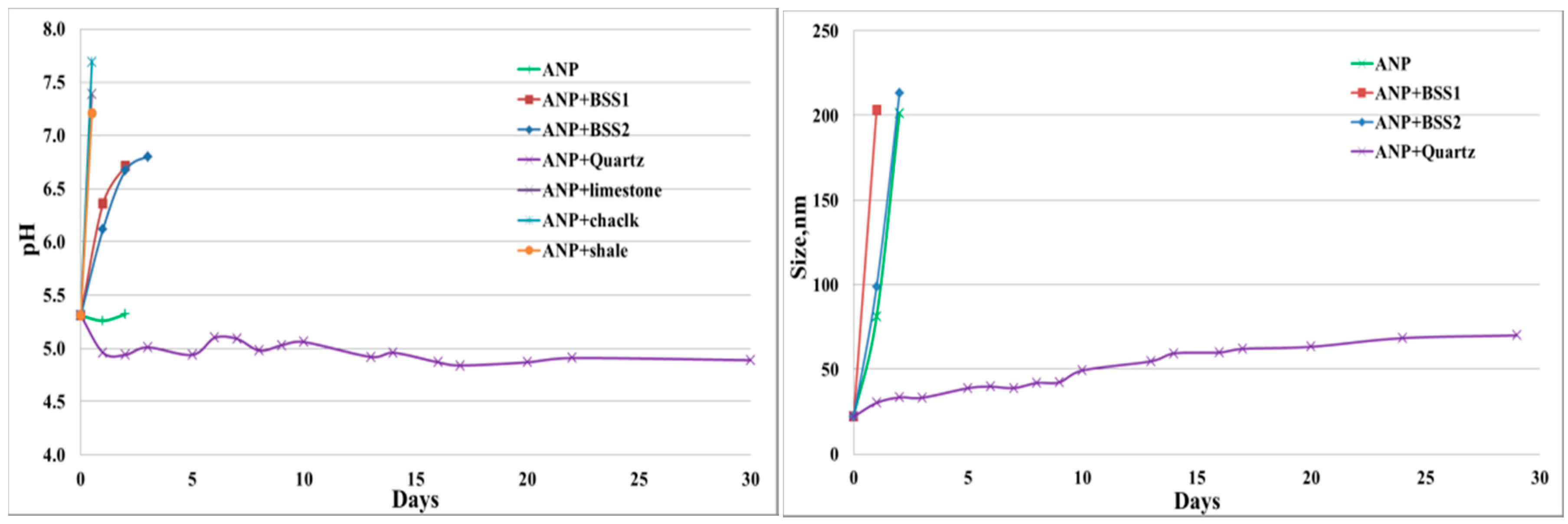 3.2. Effect of Reservoir Rocks and Crude Oils on Nanoparticle Stability