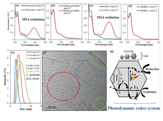 Monitoring of behavior of individual components of the precursor mixture. UV/Vis absorption spectra of tetrazolium salt producing a formazan dye upon reduction by a superoxide anion generated by photodissociation (photo-oxidation) of thiols (MSA) before (blue) and after (red) 1 min UV irradiation, the sample consisted from precursors (a) Zn(II), Cd(II) and MSA in pH 7 controlled by phosphate buffer, (b) Zn(II), Cd(II) in phosphate buffer pH 7, (c) solution of MSA in phosphate buffer pH 7 and (d) phosphate buffer pH 7 solution. QDs (quantum dots) characterization according to (e) size distribution of ZnCd QDs in range 3–5 nm after 2 (blue), 4 (red) and 8 (green) min UV irradiation and respective zeta potential in range the −20 to −40 mV, (f) Transmission electron micrograph of ZnCd QDs after 8 min UV irradiation of precursors (Zn:Cd:MSA in phosphate buffer pH 7), scale bar represents 100 nm. (g) Schematic representation of the proposed photodynamic redox system. Excited electrons (-) have a strong reduction potential and holes (+) are very strong oxidizing agents. Oxidation-reducing properties of ZnCd QDs can be significantly changed according to the band gap distance () associated with growing of QDs.