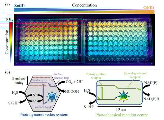 The proposed theory that nanoparticles assisted in the origin of some key (bio)molecules presumes that the feasibility of reactions occurring at nanoparticle surfaces depends on the band gap, conductivity band position, and surface electron trap location, Figure 2b (left). The oxidation-reduction properties of the nanoparticles can dramatically change according to the band gap distance. Absorption of UV quantum leads to the separation of electric charges. The electrons migrate in the ZnCd QDs until they are trapped at the surface. The trapped electrons can reduce the CO2 molecule either via two-electron transfer or possibly in a concerted two-electron reaction. The electron vacancy (hole) is initially reduced by the S2- ion of the ZnCd QDs. The ultimate electron equilibration requires external electron donors from H2S [16]. Figure S4a compares standard redox potentials and band gap energies of ZnS and CdS samples to those of the ZnCd QDs. The Figure also shows important biological reactions corresponding to the standard redox potentials and band gap energies of the semiconductors. This comparison demonstrates that the photogenerated ZnCd QDs can be used for the same reactions as those of classical bulk ZnS or CdS. It was previously shown that QDs form a conjugate with biomolecules, such as proteins [47,48] and DNA [49], and generate complex structures. UV tuning of these complex structures could lead to systems resembling photochemical reaction centers as schematically shown in Figure 2b (right).