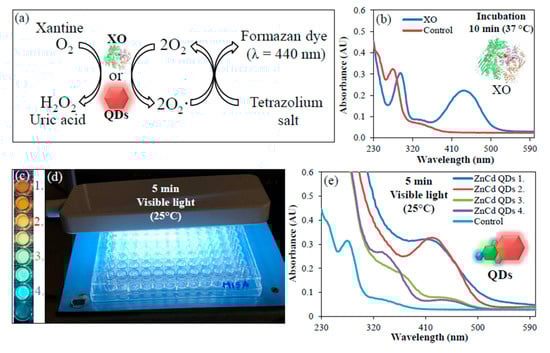 XO-like activity of ZnCd QDs. (a) Scheme of the XO activity (b) Absorption spectra of the XO substrate (blue trace) and distilled water (red trace) incubated with XO for 10 min at 37 °C (c) ZnCd QDs selected for monitoring of XO-like activity from Figure 2a (d) Photograph of visible light irradiation of mixture of ZnCd QDs with XO substrate (e) Absorption spectra obtained from XO substrate mixed with ZnCd QDs and irradiated for 5 min by visible light.