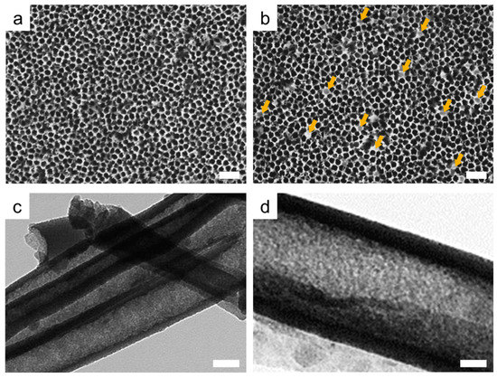 Morphological structure of pristine and sol-gel-coated anodized aluminum oxide (AAO) membranes. (a) Top-view scanning electron microscopy (SEM) images of pristine AAO membrane (b) and sol-gel-coated AAO membrane (scale bars denote 1 μm). (c,d) Constructed sol-gel nanocolumn formed on the AAO nanochannel and observed by TEM after dissolving the AAO using a NaOH buffer. Scale bars denote 100 nm and 50 nm, respectively.