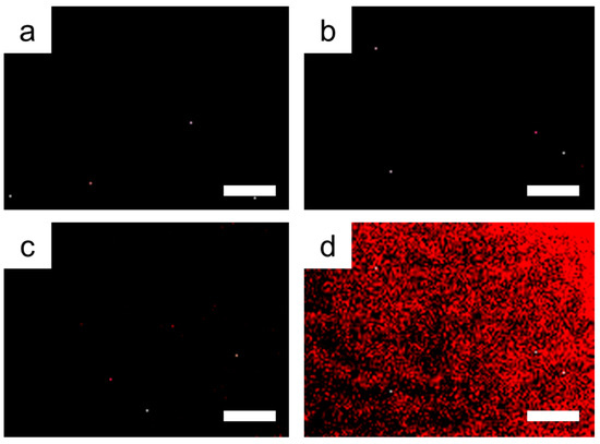 To confirm the feasibility of the sol-gel-coated AAO membrane for target-specific aptamer screening, diazinon, as a model pesticide, was confined in the gelated thin layer on the inner surface of AAO membrane and was tested with the fluorescence-tagged diazinon aptamer. The target diazinon-specific aptamer was reacted, and unbound DNA molecules were washed out using a washing buffer. Next, the AAO membranes were observed by fluorescence microscopy. When the target-specific aptamer was treated on the diazinon-containing sol-gel-coated AAO membrane, it exhibited a strong red fluorescence due to the tagged Texas Red dye (Figure 3d). The pristine AAO membrane and bare sol-gel-coated AAO membrane showed no fluorescence signal after treatment with the fluorescence-tagged diazinon aptamer and washed with buffer solution (Figure 3a,b). Thus, the non-target pesticide atrazine containing the sol-gel-coated AAO membrane also showed no fluorescence when treated with diazinon-specific aptamer (Figure 3c). This result indicated that the target molecule containing the sol-gel-coated AAO membrane has the ability to selectively bind small molecules in the cavity of the gelated matrix and DNA molecule.