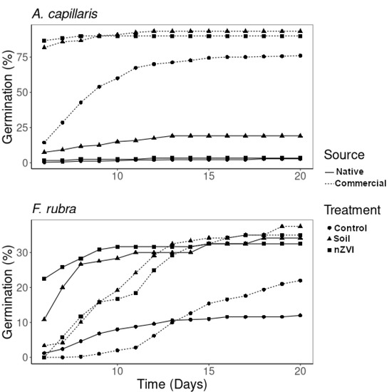 The application of nZVI did not significantly influence the germination of F. rubra seeds. Most of the native seeds of this species germinated during the first 8 days, while the commercial seeds needed 12 days (Figure 1). Although no significant differences were found between these seed types, soil treatments and seed sources (Table 2), some differences in germination times were found (Figure 1), as commercial seeds needed longer times to germinate, while native seeds treated with nZVI reached maximum germination faster. The RGR was higher for native than for commercial seedlings (Table 2) when compared with control, which result in RGR < 1 when compared with contaminated soil. Radicle lengths in the native seedlings showed no significant differences between soil treatments, but for the commercial seeds, there was an increase in the lengths under nZVI treatment when compared to the untreated soil (Table 2, EIR < 0). The effects of nZVI on F. rubra seedlings were more visible for the shoot lengths, as the longest shoots were found on the seedlings treated with nZVI (Table 2). In addition to germination, root elongation is one of the first visible symptoms of toxicity: root tips are sensitive to toxicity due to the influence of metal(loid)s in cell division and cell elongation [26]. This effect is visible in the EIR of F. rubra, which was higher for the commercial seedlings growing in contaminated soil (48.8), and lower for the native seedlings in the same treatment (19.4), thus, showing the adaptation of the native seeds for growth under metal(loid) contamination. Our results reflect that the application of nZVI not only presents no signs of toxicity in the early plant stages but also that for some seeds (native A. capillaris and commercial F. rubra), application of the amendment improved their development.