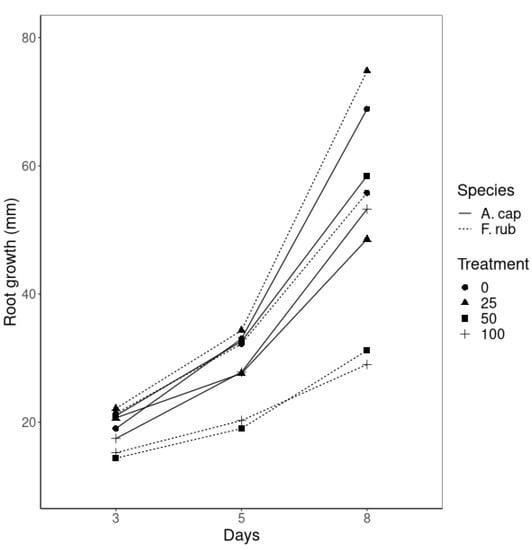 Root growth (mean value, given in mm, of 20 samples per treatment) of A. capilaris and F. rubra during the last eight days after the application of 0, 25, 50 and 100 mg nZVI L−1 to the hydroponic solution.
