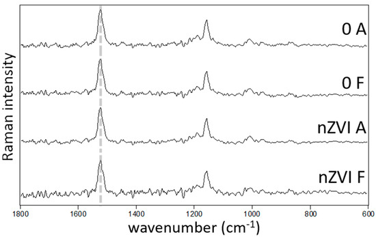 Raman spectra of A. capillaris (A) and F. rubra (F) untreated (0) and treated with 100 mg L−1 nZVI, presented as an average from three measurements at distinct zones of the leaf. The spectral features correspond to carotenoids; the v1(C=C) band position (dashed line), which may reflect changes in the carotenoid structure remains the same (1523 cm−1) among the measurements.