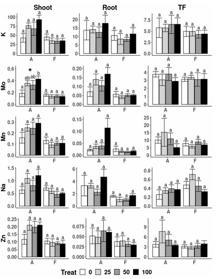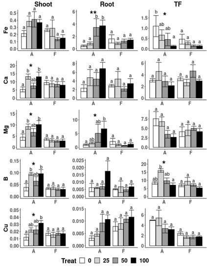 Translocation Factor (TF) and uptake of elements (g) in shoot and root biomass of A. capillaris (A) and F. rubra (F) at the end of the hydroponic experiment for the different treatments (e.g., 0, 25, 50 and 100 mg nZVI L−1). For the one-way ANOVA * p < 0.05, ** p < 0.01, no asterisks for p > 0.05. Different letters above the bars represent significant differences, according to Tukey’s test at p < 0.05.