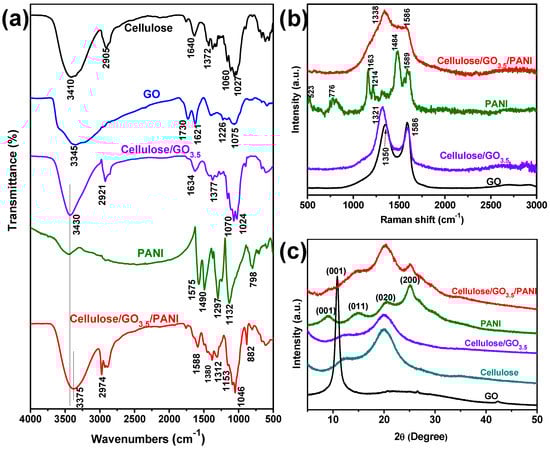 (a) Fourier Transform Infrared spectrum (FT-IR), (b) Raman, and (c) X-ray diffraction (XRD) spectra of neat cellulose, GO, PANI, cellulose/GO3.5 and cellulose/GO3.5/PANI composites.