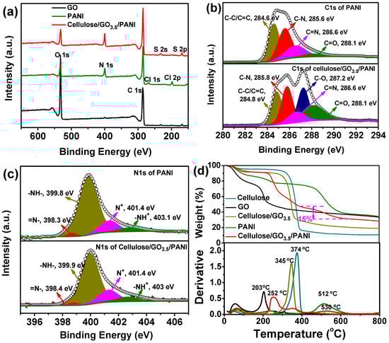 (a) X-ray photoelectron spectroscopy (XPS) survey spectra of the pristine GO, neat PANI, and the cellulose/GO3.5/PANI composite. (b) Comparison of C 1s spectra of PANI and the cellulose/GO3.5/PANI composite. (c) N 1s spectra of the cellulose/GO3.5/PANI composite and pure PANI. (d) Thermogravimetric analysis (TGA) pattern of pure cellulose, GO, PANI, cellulose/GO3.5, and cellulose/GO3.5/PANI samples.