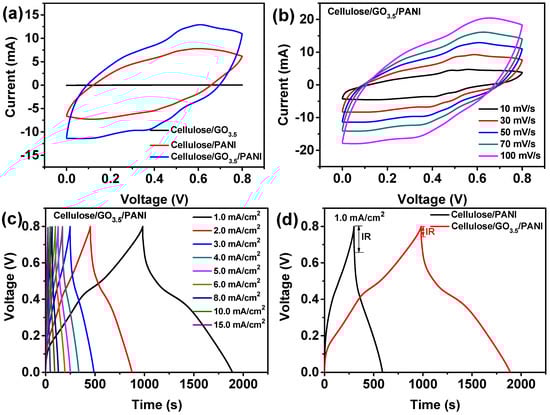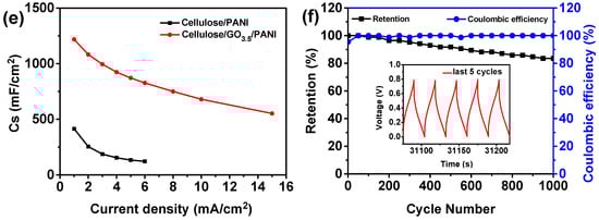 The charge storage properties were further investigated by the galvanostatic charge–discharge (GCD) measurements. The GCD profiles of the cellulose/GO3.5/PANI electrode at various current densities show nonlinear shape with two voltage stages in the discharge process (Figure 6c). At relative lower current densities of 1.0 mA/cm2, the former stage (0.8–0.45 V) with relatively short discharge time is ascribed to the electrochemical double layer capacitor (EDLC), while the later stage (0.45–0 V) with much longer discharge time is associated with a combination of EDLC and pseudocapacitive capacitance. A typical comparison of GCD curves of the cellulose/PANI and cellulose/GO3.5/PANI composite electrode is presented in Figure 6d. Benefiting from the presence of GO, the potential drop at the beginning of the discharge curve (called “IR drop”) of the cellulose/GO3.5/PANI composite is much lower than that of the cellulose/PANI electrode, revealing lower internal resistance of cellulose/GO3.5/PANI composite than cellulose/PANI composite. According to Equation (1), the areal specific capacitance of cellulose/GO3.5/PANI composite is found to be 1218 mF/cm2 at the current density of 1.0 mA/cm2. Similar calculations were done for the cellulose/PANI electrode; however, much lower areal specific capacitance was found (Figure 6e), thus confirming the high loading capacity of the cellulose/GO3.5/PANI composite. Actually, to evaluate the contribution of PANI to energy storage, a series of ternary cellulose/GO/PANI samples (GO of 3.5 wt.%) were prepared from different aniline concentrations of 0.5, 0.75, 1.0, and 1.25 M. Their electrochemical performances along with comparison with those of the cellulose/GO3.5/PANI electrode are presented in Figure S3. The largest enclosed area and the longest charging/discharging time of the cellulose/GO3.5/PANI electrode indicates the best capacitive performance among the four samples. Ideal performance on the cellulose/GO3.5/PANI electrode may be due to its unique pore structure and the appropriate size of PANI nanoclusters. When the aniline concentration increased to 1.25 M, the thicker coating layer of PANI might cause its underutilization that induces a decrease of the specific capacitance [56].