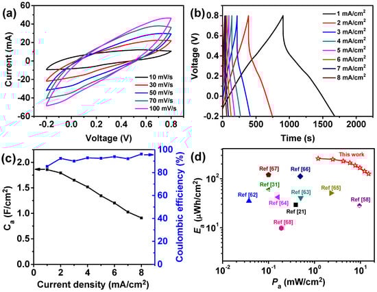 where I is the charge–discharge current (mA), t represents the discharge time (s), S is the area of the electrode (cm2), and ΔV is the potential window of the discharge curve excluding initial drop (V). For the symmetric supercapacitor device, the areal specific capacitance (Ca in mF cm−2), the energy density (Ea in µW h cm−2) and the power density (Pa in µW cm−2) were calculated according to the following equations [36,37,38,39]: