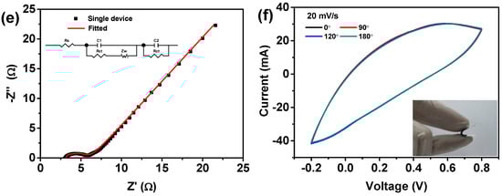Moreover, according to Equations (4) and (5), the energy and power density of the assembled supercapacitor is obtained from the GCD curves and is manifested in the Ragone diagram (Figure 7d). The device achieves a maximum energy density of 258.2 µWh/cm2 at a power density of 1201.4 µW/cm2, and still can store an energy density of 126.3 µWh/cm2 at the power density of 15.1 mW/cm2 as the current density increased from 1.0 to 8.0 mA/cm2. The corresponding areal energy and power density values are much higher than the recently reported supercapacitors based on PANI/CNT paper (29.4 µWh/cm2 at 391 µW/cm2) [21], CNFs/rGO/PPy (60.5 µWh/cm2 at 0.1 MW/cm2) [31], CNF/RGO/CNT aerogel (28.4 µWh/cm2 at 9.5 MW/cm2) [58], RGO/MnO2 paper (35.1 µWh/cm2 at 37.5 µW/cm2) [62], rGO/PANI-PSS papers (40.7 µWh/cm2 at 500 µW/cm2) [63], PANI/PVA-H2SO4 chemical hydrogel film (42 µWh/cm2 at 160 µW/cm2) [64], CNT@PANI film (50.98 µWh/cm2 at 2294 µW/cm2) [65], CNT/activated carbon fiber felt (112 µWh/cm2 at 490 µW/cm2) [66], PANI/GN/BC paper (120 µWh/cm2 at 100 µW/cm2) [67], and carbon microfiber/MWCNT (9.8 µWh/cm2 at 189.4 µW/cm2) [68]. EIS analysis of the single device (Figure 7e) indicates that the Rs and Rct are of 3.2 and 1.9 Ω, respectively. The electrochemical properties of the fabricated supercapacitor were also tested at various bending angles (from 0° to 180°, Figure 7f). The overlapped CV curves demonstrate the device has excellent electrochemical behavior under various bending deformations. The relatively small Rs and Rct and excellent flexibility indicate its appropriate configuration design, and some larger area supercapacitors could be fabricated for integrating into wearable electronics.