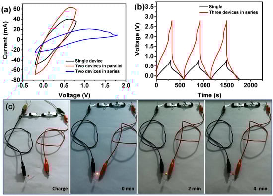 (a) CV profiles of the single device, two devices in series, and two devices in parallel connection at a scan rate of 50 mV/s. (b) GCD profiles of the single device and three devices in series at a current density of 2 mA/cm2. (c) Optical pictures of three devices in series connection to light a LED lamp for 4 min.