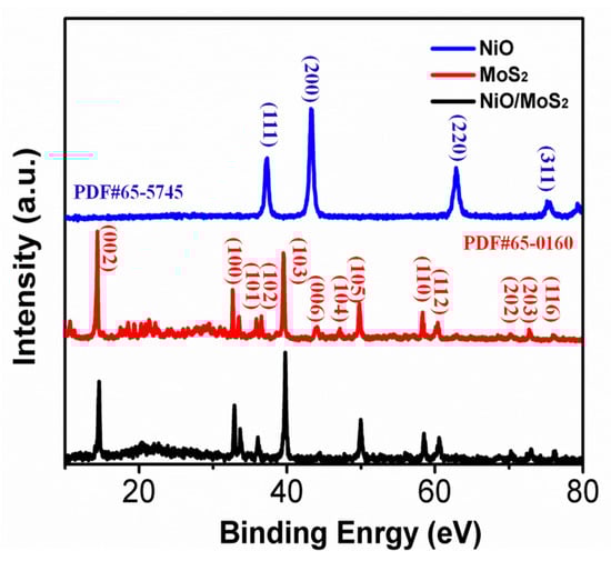 XRD patterns for MoS2:NiO-3:1, NiO and MoS2.