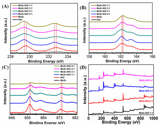 XPS spectra of MoS2:NiO catalysts (D) in the Mo 3d (A), S 2p (B) and Ni 2p (C) spectral regions.