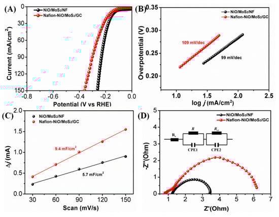 Electrochemical performance for HER. (A) J–V curves of representative assembling conditions: NiO/MoS2/NF and Nafion-NiO/MoS2/GC; (B) Tafel plots for Nafion–NiO/MoS2/GC and NiO/MoS2/NF; (C) capacitive current at 0.165 V as a function of the scan rate; (D) EIS curves of electrodes at an overpotential of 200 mV.