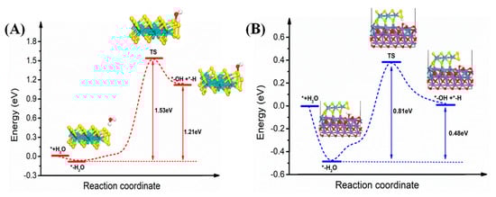 Energy pathway for water dissociation at the MoS2 zigzag edge (A) and the MoS2/NiO (111) interface (B) with atomic configurations of initial state (water adsorption), transition state (TS) and final state (water dissociation). The reaction energy and the activation barrier are indicated in the inset.