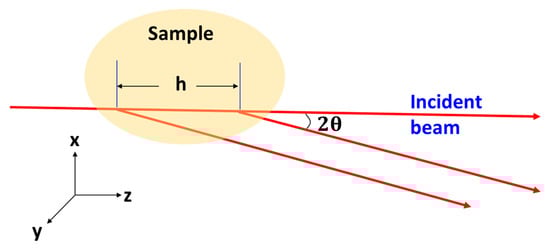 As illustrated in Figure 1, the scattered beams at angle from two points within the sample with a distance h along the incident beam direction have a difference in path length once they reach the detector, where the path length difference is simply . This path length difference needs to be less than the longitudinal coherence length of the incident beam given as , where and denote the incident wavelength and the wavelength spread, respectively. Explicitly, the above statement can be expressed as: