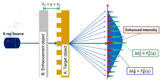 A silicon line grating was used as the target (A), and an amorphous carbon disc (B) with a strong scattering cross-section was used as the enhancement object, as shown in Figure 2. The gap between these two objects was adjusted between micrometers and tens of millimeters by spacers with different thicknesses. The scattering intensities from the target grating can be described as [11,12]: