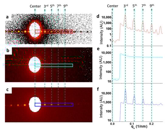 The scattering patterns recorded on a 2D detector of Si grating, National Institute of Standards and Technology Standard Reference Materials (NIST SRM) 3600, and the composite sample at a separation distance of 537 µm are given in (a–c), respectively. The corresponding averaged intensities are given in (d–f), respectively. For (d–f), the intensities presented were from their sector average.