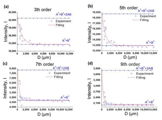 The fitting of the experiment scattering intensities of 3rd (a), 5th (b), 7th (c), and 9th (d) peaks. The intensity of = 0 is calculated by the value of . The red dotted line represents an exponential fit of the data following Equation (3) to estimate the effective longitudinal coherence length .