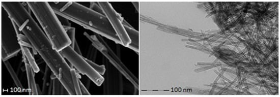 SEM (left) and TEM (right) images of synthesized nanotubes.