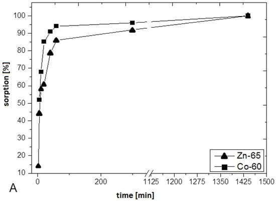 The kinetics of 60Co and 65Zn cation adsorptions onto TiO2 nanotubes were measured and analyzed. As shown in Figure 2, the adsorption processes of these two cations are relatively fast, and they are considerably faster than for 137Cs+ [10]. In the case of 137Cs, we previously found that ion exchange processes occur not only on the nanotube surfaces, but also on hydroxyl functional groups present inside the nanotubes [10]. In this case, the ion exchange must be preceded by desolvation of cations and their diffusion inside the tubes. Large, hydrated Co2+(aq) and Zn2+(aq) cations cannot intercalate in the very small channels of TiO2 nanotubes, so they are only adsorbed on surface functional groups, therefore allowing adsorption to occur much faster (Figure 3).