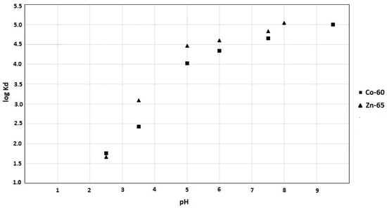 The dependence of 60Co and 65Zn distribution coefficients on solution pH.