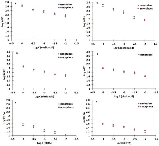 As shown in Figure 5, TiO2 nanotubes exhibit adsorption properties very similar to the amorphous hydrated TiO2. However, the presence of chelators significantly reduces sorption of 65Zn by both sorbents. This effect is observed at concentrations as low as 10−4 M. The most effective chelator is EDTA, which, even at a concentration of 10−4 M, decreases the adsorption of 65Zn to log Kd = 1.6. In contrast, the 65Zn log Kd was considerably higher (approx. 4.5) when measured for a solution without EDTA. Citric and oxalic acids do not form such strong complexes with Zn2+ ions, but nearly a 100-fold decrease in the distribution coefficient is still observed in the presence of these ligands at 10−4 M concentrations. At pH = 4, which is typical for decontamination fluids, but without the addition of any chelators, the log Kd values are much higher and equal, respectively, 3.2 and 3.7 for Co-60 and Zn-65.