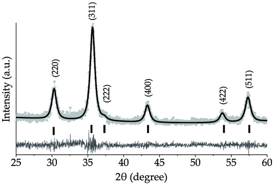 In order to confirm the crystal structure of samples, crystallite and particle size, and their distribution, X-Ray powder diffraction analysis (XRD) and Transmission Electron Microscopy study (TEM) were performed. It is clear that XRD patterns of all samples (Figure S1) are in good agreement with the reference crystallographic card of Fe3O4 (PDF No. 19-0629). Peaks at 30.1, 35.4, 37.1, 43.1, 53.4, and 56.9° correspond to (220), (311), (222), (400), (422), and (511) crystallographic planes, respectively. Figure 1 shows a diffraction pattern of the MW-HS-0 sample chosen as representative. It is obvious that the samples demonstrate a high crystallinity, and there are no additional reflections, which indicates the high sample purity. In order to obtain information on lattice parameters, crystallite size and their distribution, the received XRD data were calculated by the WPPM method for all samples. This approach allows one to determine not only the volume weighted crystallite size (as the Scherrer equation does), but to calculate the weighted number.