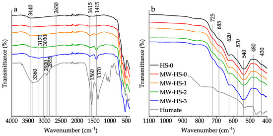 All samples were studied by reflectance FTIR-spectroscopy in order to study the surface composition of magnetite nanoparticles and to confirm that the potassium humate encapsulation was successful. In Figure 3a, attenuated total reflection IR spectra of initial potassium humate and all prepared magnetite samples are shown. Upon closer examination of the middle infrared region (Figure 3b), it is getting clear that the surface composition of all magnetite-containing samples is complex. It appears that there are various iron oxide phases exhibiting Fe-O lattice vibration bands at different wavenumbers on particles surfaces [59,60,61] as follows: magnetite (a shoulder at 570 cm−1), maghemite (bands at 430, 620 cm−1 and shoulders at 685 and 725 cm−1), and hematite (bands at 480 and 540 cm−1). Also, a comparison of the recorded spectra (Figure 3a) indicates the successful polyanion adsorption on the surface of all magnetite samples. Thus, a growth of OH-groups bands is observed in the spectra of the MW-HS-1, MW-HS-2, and MW-HS-3 samples (a broad band with the maximum at 3440 cm−1), and the bands at 1615 and 1415 cm−1 corresponding to antisymmetric and symmetric stretching vibrations of carboxylate ion bonded with the magnetite surface appear. These bands correspond to the bands in the initial potassium humate spectrum with maxima at 1560 and 1370 cm−1. The shift of the band maxima in magnetite-containing samples is due to the formation of a weaker bond of -COO− with the amphoteric iron species on the nanoparticle surface. Also, it can be seen that the magnetite samples obtained in the presence of potassium humate have different intensity ratio of the bands at 1615 and 1415 cm−1. In the MW-HS-2, MW-HS-3 samples, bands at 3170 and 3030 cm−1 corresponding to stretching vibrations of N-H and C-H bonds, respectively, appear. Based on the obtained data, we can suppose that differences in the synthetic protocol lead to differences in the chemical composition of the produced nanoparticles surface.