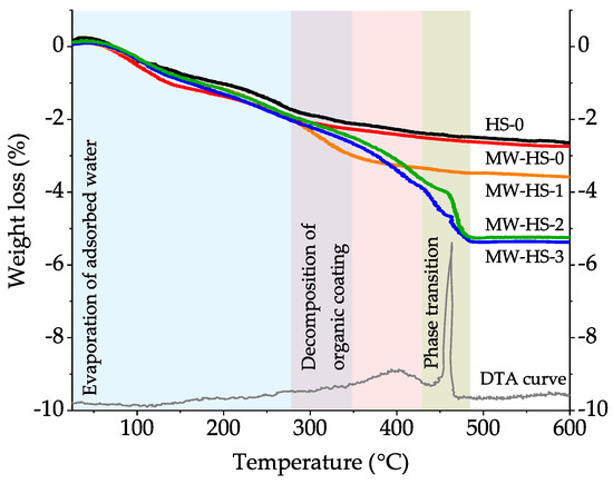 Thermogravimetric curves for the obtained samples and a representative DTA curve of the MW-HS-3 sample.