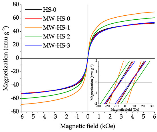 For each sample, magnetization curves were recorded at room temperature in the presence of an external magnetic field up to 6.3 kOe (Figure 5). Saturation magnetization (MS), which is the co-directional orientation of all magnetic moments, was calculated by the approximation of the measured magnetization values at the strong field. The saturation magnetization of the samples obtained in absence of potassium humate via conventional (HS-0) and microwave (MW-HS-0) heating has similar values, 58 and 60 emu g−1, respectively (Table 2). However, the samples obtained in the presence of the stabilizer show different saturation magnetization values: 80, 68, and 60 emu g−1 for MW-HS-1, MW-HS-2, and MW-HS-3, respectively. This behavior cannot be explained by the size effect, because nanoparticles of all coated samples are in the same size range. The size distributions are also quite narrow. Moreover, the MW-HS-0 sample has the narrowest distribution. However, this does not demonstrate high magnetization, which is similar to the uncoated sample value. It is reasonable to assume that the key factor influencing the magnetic properties is the polyanion adsorbed on the nanoparticle surface. There are studies describing the magnetic properties of magnetite coated with humate, their results show that in comparison with unstabilized nanoparticles, samples with a stabilizer have a lower magnetization value in the range of 50–60 emu g−1 [64,65]. In these works, the weakening of magnetic properties is associated with a decrease in the mass fraction of the magnetic component in the composite. We have found the opposite effect as a result of the synthesis of the MW-HS-1, MW-HS-2 samples. Thereby, when using the natural polyanion as a stabilizer, a noticeable increase in the magnetization of the sample is observed. When comparing the results of our study and of the previously described studies, we can conclude that such a difference in MS with similar average sizes of nanoparticles is observed due to the difference in mass fractions of the organic compound adsorbed on the surface of the nanoparticles. Thus, in the above studies, the mass fraction of the natural polyanion reaches 10%, which leads to a noticeable decrease in the magnetization per unit mass. However, the MW-HS-1 sample, which represents magnetite nanoparticles with a mass fraction of organic stabilizer not exceeding 1 wt.% (according to TGA measurements), shows a noticeable increase in saturation magnetization, which corresponds to 80 emu g–1. This unusual behavior is primarily due to the interaction of the functional groups of the polyanion with iron atoms on the surface of the nanoparticles. The most probable assumption is the interaction of the carboxy group with surface iron atoms, as was shown earlier when using another capping agent, including oleic acid [66,67,68,69]. It is surprising that, in order to achieve improved magnetic and colloidal (will be considered later) properties, it is not necessary to stabilize the entire surface of nanoparticles, but it is sufficient to stabilize only the most active metal atoms to achieve a Fe-O bond length on the surface of the nanoparticle comparable with the bond length in the bulk [70]. This hypothesis is confirmed by the fact that with an increase in the mass fraction of adsorbed polyanion on the surface of nanoparticles, a noticeable decrease in their magnetic properties is observed (samples MW-HS-2, MW-HS-3 with a content of organic component on the surface of nanoparticles of 2.5 and 2.6 wt.%, respectively). Thus, we can say that the selection of the optimal amount of a stabilizer and the capping method of the surface of magnetic materials, in particular magnetite, plays a tremendous role in its magnetic properties.