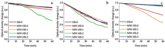 One can see a clear positive influence of microwave heating on the particle size: the sample obtained via a conventional thermal heating (HS-0) has a broader size distribution than that obtained in microwave conditions (MW-HS-0). The use of potassium humate and its injection time also have an impact on the nanoparticle size: in the case of the MW-HS-1 sample, humate only plays a role of a surface stabilizer due to post-encapsulation process resulting in a decreased average size and distribution, while in the case of the MW-HS-2 and MW-HS-3 samples, it is involved in both crystal growth and nanoparticles surface stabilization processes, and the obtained nanoparticles seem to be larger, because of the increased amount of the amorphous component (see Section 3.3). However, the growth of the nanoparticle size in these samples corresponds to coarsening of their crystallites.