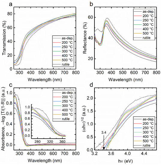 (a) Transmittance spectra, (b) reflectance spectra, (c) absorbance spectra and (d) Tauc plots of the ALD TiO2 thin films grown at 150 °C and heat treated at different temperatures indicated in the plots. The spectra of a rutile thin film of equal thickness is show as dotted lines using the data acquired from Ref. [18].