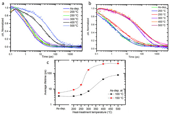Normalized transient absorption decays profile at 960 nm of samples deposited at (a) 100 and (b) 150 °C without heat treatment temperature indicated in the plot (c) Average lifetimes as function of the heat-treatment temperature for samples deposited at 100 and 150 °C.