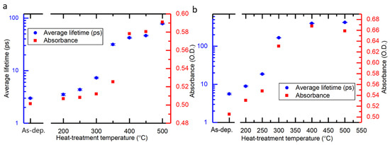 Average lifetime as a function of heat-treatment temperature shown along with absorbance of the samples at 320 nm from steady state spectra for samples grown at (a) 100 °C and (b) 150 °C.