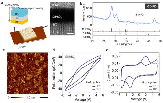 Standalone FE capacitors with 8 nm FE-HfO2 are fabricated on p-type Si substrate (1019 at/cm3) (Figure 1a). Our material is deposited by ALD at 300 °C, the precursors employed are HfCl4 and SiCl4 as Hf and Si sources and H2O as oxidant. The pulse ratio of Si:Hf = 1:11 ensures a final concentration of Si dopant in range of 4 at% Si in the doped HfO2. The stoichiometry is confirmed by Rutherford back scattering (RBS) with elastic recoil detection (ERD), not shown. After the oxide is formed, 50 nm thick highly doped n-type Si capping layer is deposited by physical vapor deposition. The whole stack is annealed using a 1000 °C for 30 sec for the oxide crystallization. After the annealing, the Si capping layer is patterned thereby creating individual capacitors of various sizes with reactive ion etching (e.g., 5 × 5 µm2 imaged by AFM in the inset Figure 1a). A schematic of the sample structure is shown in Figure 1a. Cross-sectional HRTEM image of the capacitor is shown in the inset of Figure 1a, confirming the layer thickness, the sharp interfaces, and the polycrystalline nature of the film (see the Supporting Information Figure S1). As described elsewhere the presence of Si is crucial to obtain the orthorhombic phase after crystallization, we also use a capping layer (doped Poly-Si) to minimize the presence of monoclinic phase []. Grazing incident X-ray diffraction (GIXRD) measurements are performed with a Jordan Valley JVX7300M (Bruker Semiconductor AFM, Santa Barbara, CA, USA), monochromatic Cu Kα radiation (Ge monochromator) is used at a grazing angle of 0.5°. The spectrum is acquired after crystallization, confirming they have a high degree of crystallinity (Figure 1b). The phase ratio is typical for the imec flow and is quantified by Rietveld refinement of the grazing incidence X-ray diffraction. Furthermore, the phase composition has been seen to be strongly linked to electrode size, shape, electrode pad density, and thickness. Conventional P-V hysteresis and I-V loops are acquired on capacitors with size 100 × 100 µm2 and shown in Figure 1d,e. To summarize, electrically extracted values for remnant polarization (Pr) and coercive field (Ec) are 20 µC/cm2 and 2.6 MV/cm respectively. Our devices show a 105 cycles endurance associated with a slight wake-up effect, where an initial increase in the remnant polarization is followed by a stable cycling behavior, as reported elsewhere []. Figure 1c shows the morphology of the FE-HfO2 in the area where the electrode has been removed. This is the area of interest in this study as we use the probe directly in contact with the oxide surface. Note that the presence of a top electrode between the tip and oxide largely suppresses the spatial variability in the output of the SPM techniques. For example, in the PFM case, when the thickness of the top electrode is non-negligible compared with the thickness of the oxide, this limits the sensing capability of local surface deformations []. Therefore, the generated contrast is no longer a function of the tip position and the electrode thickness determine the minimal distinguishable size of a domain []. Similarly, for C-AFM and DPFM both techniques lose their spatial variability if the generated charges are averaged by a metal electrode [].