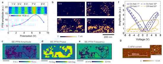 To enhance sensing capabilities, we select BE-PFM. In contrast with traditional PFM, here ac excitation is used over a selected frequency band that is close to the contact resonance of the tip-sample system []. The dynamic tip-sample interaction can be approximated by a simple harmonic oscillator (SHO) model whose parameters such as resonant frequency, amplitude at resonance, phase and quality factor describe the energy dissipated due to tip-surface interactions. In case of ferroelectric materials, BE-PFM allows measurement of the amplitude and phase response of the cantilever in a frequency band encompassing the resonant peak. This approach allows extraction of the piezoresponse amplitude and phase at the resonance frequency where the signal to noise ratio is highest, even if the resonance peak shifts within the sample area. Moreover, the increased strength of the acquired piezoresponse signal, enables lower voltage values of the ac readout while achieving good signal to noise. Finally, by normalizing the piezoresponse using the SHO fitting model, BE-PFM minimizes the crosstalk between PFM and topographic features. For more details on the BE-PFM method the reader is directed to various dedicated works [,,].