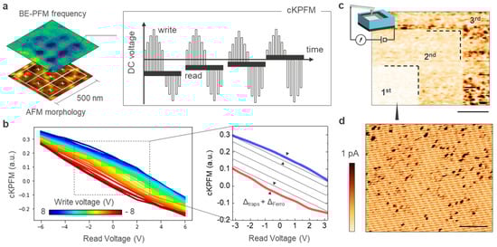 Although BE-PFM correctly captures the contrast between the different regions of the polycrystalline oxide, the contrast formation mechanisms of the technique does not allow electrostatic artefacts in the results to be excluded, as shown by Balke and co-authors in the case of electrochemical effects and surface charging []. The same authors proposed cKPFM as an alternative method to distinguish between electrostatic effects, charge injection phenomena, and ferroelectric behavior. The cKPFM mode is a spectroscopic method, that uses the sequential combination of ‘writing’ and ‘reading’ voltage pulses applied to the tip-sample system []. For each write voltages, a series of read signals are recorded using the aforementioned BE-PFM approach. The Vwrite pulses define the range of voltages in which the electrostatic and ferroelectric effects will be differentiated. The Vread are pulses with relatively smaller amplitude and are used to sense the change in contact potential difference (CPD) in the tip-sample junction that are induced by the Vwrite. The technique alternates a dc voltage sweep at progressively higher amplitudes with the measurement of the change of CPD by means of small amplitude read steps (inset Figure 3a). To enable this, a probing ac signal is constantly applied on top of the ‘writing’ and ‘reading’ pulses and the cantilever response is detected using the BE–PFM scheme. As described earlier, the ac voltage frequency consists of a band of frequencies around the value of contact resonance. In a cKPFM experiment the Vwrite and Vread are sequentially alternated and swept in the range of choice. Therefore, one can sense the progressive change in the surface potential that is induced after each Vwrite is ramped. To some extent, the technique can be considered as the combination of (1) Kelvin probe force microscopy (KPFM) for the underlying analysis of surface potential, and (2) on-field voltage spectroscopy using BE-PFM. All performed with the probe in contact with the surface, thus the name.