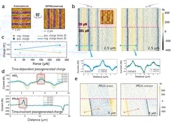 A possible alternative to minimize the impact of undesired electrostatic and dielectric degradation effects is represented by the direct piezoelectric force microscopy method. In fact, ferroelectrics represent a sub-set of piezoelectric materials, thus they can generate electrical charge under the effect of a mechanical strain applied. This property is exploited by DPFM to sense the amount of charge generated by the application of a mechanical load. The technique probes the linear relation between mechanical deformation and piezo-generated electrical charge in piezoelectric materials []. Importantly, by using mechanical means, this method minimizes the possible electrostatic interaction between tip and sample, thus reducing undesired effects connected with electrically active defects. Clearly, the range of load force applicable by the probe must be carefully selected, to remain below the plastic deformation limit of the material under study, i.e., avoiding any irreversible modification of the surface. Using a relatively high load force (ca. µN) on a confined contact area (ca. tens of nm2), DPFM induces a small volume change and senses the generated charges with a low noise transimpedance amplifier. Once more, low current range sensitivity is required (0.1 fA-10 pA). The use of full metal probes is indicated to avoid the loss of conductivity in coated tips used under high pressure, here we use full platinum 25PtIr300B (Rocky Mountains nanotechnology, Holladay, UT, USA). Previously, DPFM has been used to extract piezo-generated charges in conventional piezoelectric samples such as lead zirconate titanite (PZT), periodically poled lithium niobate (PPLN), and bismuth ferrite thin films [,]. These materials present natural domain structures that are easy to detect and allow the DPFM to sense directly the linear dependence between the piezo-generated charge and tip-induced load forces, showing good agreement with previously reported values for the extracted values of pC N−1. For the sake of clarity, in Supporting Materials Figure S5 we report on the comparison between PPLN and FE-HfO2 using the same probe and similar stress conditions. Importantly, DPFM does not provide any visible results in the range of load force between 1 and 100 µN on the pristine surface of the FE-HfO2. Moreover, the absence of natural domain structures (compared to PZT or PPLN) does not help in correlating morphological and electrical features. Thus, we performed a tip-induced dc polarization to define artificial zones (rectangles) of opposite ferroelectric polarization regions as in Figure 4a (Vpol = ± 7 V, scan angle 90°). The results of the DPFM are presented in Figure 4b, in which we perform a readout at 0° scan angle (trace and retrace are shown). As highlighted by a red dashed line, the force is drastically changed at approximately the middle of the image (Figure 4b). By integrating the current profiles, we can obtain the charges built up by the direct piezoelectric effect, for each of the different peaks, see inset Figure 4b. Expecting a linear dependence of the charge with applied force, we averaged the charges obtained from each of the peaks, and plotted as a function of applied force, see Figure 4c. A linear fitting is used to try to correlate the charge with applied load. However, this linear fitting cannot be realized (R2 = 0.34) concluding that the generated charges collected are not dependent upon applied force.
