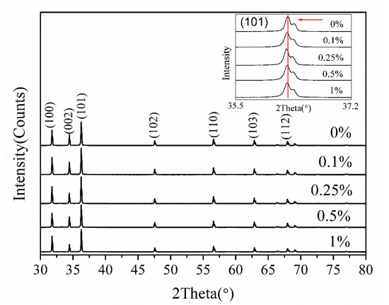 XRD spectra of undoped ZnO and lightly Cu-doped ZnO with concentrations of 0.1%, 0.25%, 0.5%, and 1%. The inset is the magnified patterns of (101) crystal direction.