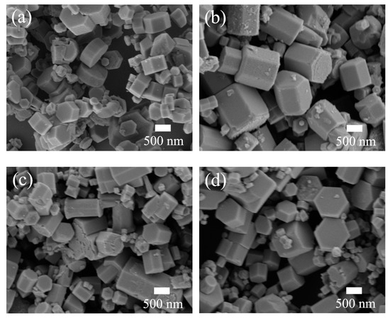 To study effects of Cu concentration on the morphology of lightly Cu-doped ZnO samples, SEM measurement was performed. The results are represented in Figure 2. In the absence of Cu dopants, the morphologies of the obtained undoped ZnO nanocrystals were nanoprisms which were not uniform. The diameter and thickness of the nanoprisms were in a range of 310–800 nm and 200–400 nm, respectively, as shown in Figure 2a. After the addition of Cu dopants with a molar ratio of 0.25%, the nanoprisms were relatively more uniform and the thickness of the nanoprisms increased to a range of 400–1000 nm with the diameter nearly unchanged (Figure 2b). With a further increase of the molar ratio of Cu dopants to 0.5%, the diameters of the nanoprisms tapered to a range of 250–500 nm (Figure 2c). When the molar ratio of Cu dopants reached 1%, the diameters of the nanoprisms increased to the range of 400–1000 nm again as shown in Figure 2d. The SEM results illustrate that the aspect ratio of ZnO nanocrystals can be modulated by Cu dopants, because of which the rate of nucleation and subsequent growth can be influenced. Similar results were also reported in Cu-doped ZnO nanocrystals prepared via the vapor transport method [25] and hydrothermal method [18].