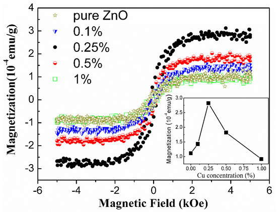 The room temperature field-dependent magnetization (M–H) curves of undoped and lightly Cu-doped ZnO nanocrystals with different Cu concentrations.