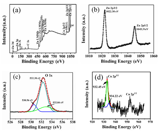 XPS spectra of lightly Cu-doped ZnO (0.25%) nanocrystals: (a) Wide-scan spectrum; (b–d) the corresponding narrow-scan spectra of Zn 2p, O 1s, and Cu 2p, respectively. Peak positions are referenced to the adventitious C 1s peak taken to be at 284.6 eV.