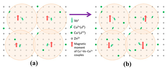 Grounded on the above PL observations and the structural properties presented in Figure 1 and Figure 5, we go back to the magnetic properties of the as-prepared samples in Figure 3, which show that the saturated magnetization reached the maximum at the Cu concentration of 0.25 at.% and then decreased with Cu concentration increasing to 1%. The RTFM in undoped ZnO is generally attributed to oxygen vacancies (VO) which can initiate defect-related hybridization at the Fermi level and establish a long-range ferromagnetic ordering [30,45]. When Cu ions were incorporated into Zn sites, Herng et al. pointed out that both oxygen vacancies (VO) and Cu dopants contributed to RTFM through an indirect double-exchange model, e.g., Cu+-VO-Cu2+ [46]. In this model, Cu dopants are mediated by the Vo orbital which has a large size with a radius of about 2.25 times the lattice constant. The Cu ions with different states coupled ferromagnetically by virtual hopping of the extra electron from one ion to another via VO orbital. Noteworthy, the Cu2+ ions outside the range of Vo vacancies would remain magnetically disordered due to the lack of the indirect double-exchange coupling channel, and only Cu2+ ions residing in the range of Vo vacancies can couple ferromagnetically in this model. This means that only a small fraction of the Cu2+ can contribute to the observed ferromagnetic signal. In our case, the Cu concentration was very low and the effect of impurity phases can be ruled out. Cu ions were incorporated into Zn sites indicated by XRD results (Figure 1). Further, our XPS measurement reveals that Cu ions were of two valent states and the proportion of the nonmagnetic Cu1+ (d10) ions was not less than 80% of all the Cu ions in all the Cu doped samples. This is also consistent with the results (83%) reported in [46] that the Cu dopants in the proximity of Vo orbital would behave more like d10 (Cu1+-like) when receiving the doped electrons. In this Cu-doped ZnO system, both oxygen vacancies and Cu dopants can contribute to RTFM through an indirect double-exchange model. However, our PL results demonstrate that the oxygen deficiency distributions remained nearly unchanged with increasing Cu concentration under low doping level. Therefore, it can be concluded that Cu dopants and their coupling with oxygen deficiencies are responsible for the observed phenomenon. Based on the above analysis, a possible mechanism for the magnetic moment evolution with increasing Cu concentration is suggested, as illustrated in Figure 6. At the initial state, the doping of Cu2+ ions can couple with Vo+ ferromagnetically through indirect double-exchange model and enhance the long-range ferromagnetic ordering since magnetic Cu2+ ions were introduced into ZnO wurtzite structure (Figure 6a). With increasing Cu dopant concentration, the distance between two Cu ions becomes shorter and shorter. Feng et al. found that antiferromagnetic configuration was favored over the ferromagnetic one when the distance between Cu ions was in a certain range based on the B3LYP hybrid density functional [47]. Therefore, it is reasonable to propose that with further increasing Cu concentration beyond 0.25% continuously at low doping level (~1% at most), the distance between Cu ions became shorter and the antiferromagnetic couples were dominated by the Cu ions generated, resulting in the declination of the magnetization (Figure 6b). This antiferromagnetic phenomenon was also reported in other TM-doped ZnO systems, such as Co [48], Ni [49], and Mn [50,51]. Further work needs to be done to study the coupling behavior between the magnetic dopants and defects on the ferromagnetism of Cu-doped ZnO system at low doping level.
