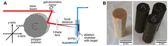 (A) Experimental setup of the laser-based continuous synthesis of colloidal nanoparticles (NPs); the laser beam is moved by a galvanometric mirror (slow axis), with supersonic lateral speed by a polygon scanner (fast axis) and focused by an f-theta lens on the metal target placed in the flow chamber. (B) Blank (left) and wash-coated (right) cordierite carriers with 3 wt.% laser-generated PtPd NP/Al2O3 catalysts.