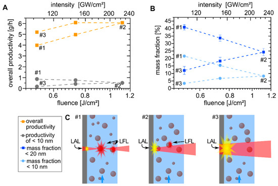 Influence of the applied laser fluence due to the change in the focal plane position on (A) the overall productivity (orange squares) and the productivity of the mass fraction of platinum particles smaller than 10 nm (gray circles) and (B) the mass fraction of NP <20 nm (blue squares) and <10 nm (light blue circles). (C) The sketches are related to the three different focal positions and indicate the change of laser ablation in liquid (LAL) and laser fragmentation in liquid (LFL) during focal plane shift.