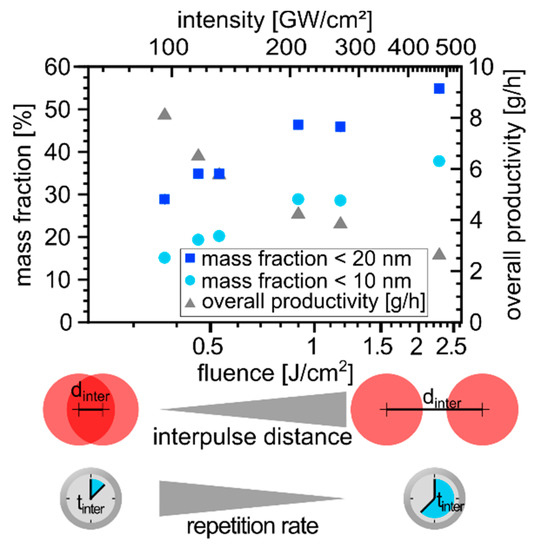 Influence of laser fluence on the mass fraction of Pt NPs <10 (light blue circles) and <20 nm (blue squares) and the overall productivity (gray triangles). The sketch below the graph indicates the change in the lateral interpulse distance dinter as well as the repetition rate (inverse temporal interpulse distance tinter) with changing pulse energy at constant laser power.